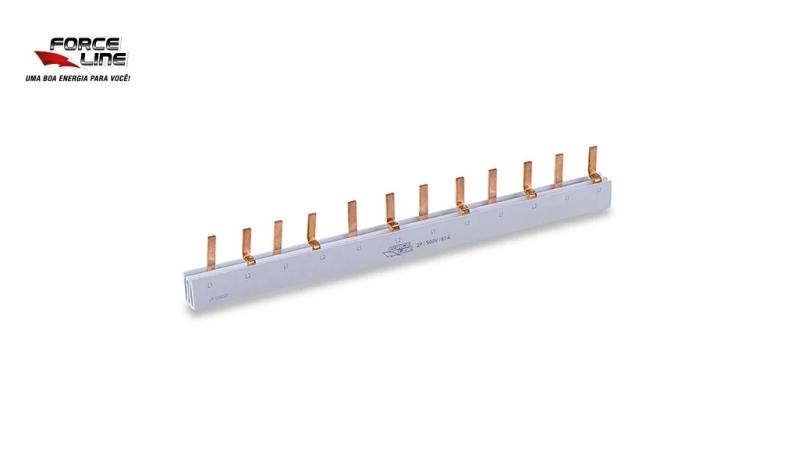 BARRAMENTO FORCELINE BIFASICO 80A 12POLOS 215MM. • TIPO PENTE (FASE) • 12 PÓLOS • BIFÁSICO • 80A • MATERIAL COBRE - COMPRIMENTO: 21,5 CM - ALTURA: 1 CM - LARGURA: 3 CM